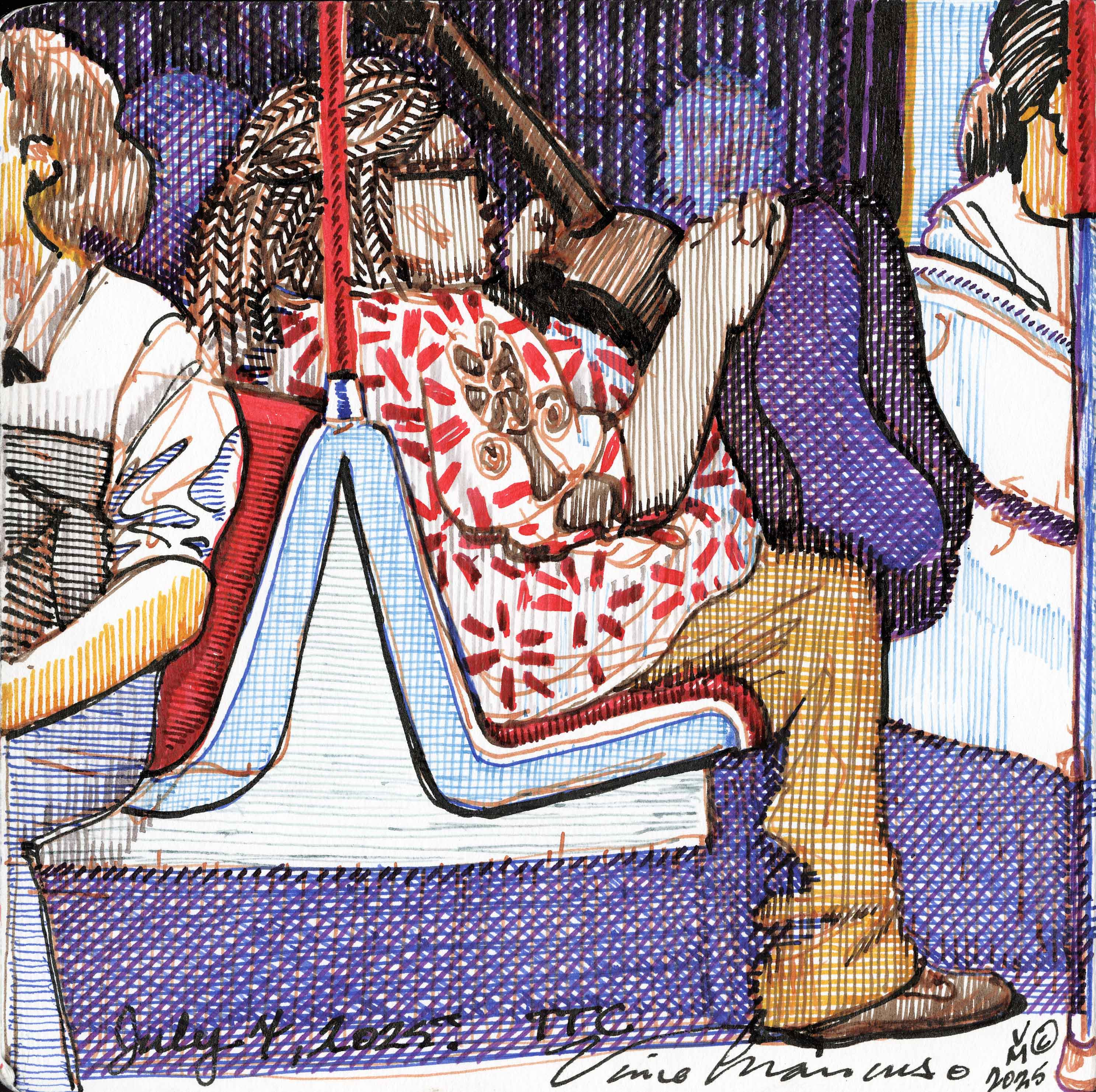 Drawing on location has been a part of my practice for 42 years. I have always found that drawing rather then taking photographs when travelling provides a deeper and richer way of understanding the world. Because my larger scale paintings are created from my memories, this practice of drawing what I see and where I have been gives my formal paintings greater depth and authenticity regarding lighting, settings, objects and people. Born and raised in Toronto, Canada riding the the subway has been a consistent experience my entire life. In my city the train is fondly referred to as riding the Rocket or sometimes the Red Rocket, a reference to the colour red, the transits corporate colour. In this section you will see the drawings that I have done while riding the train.